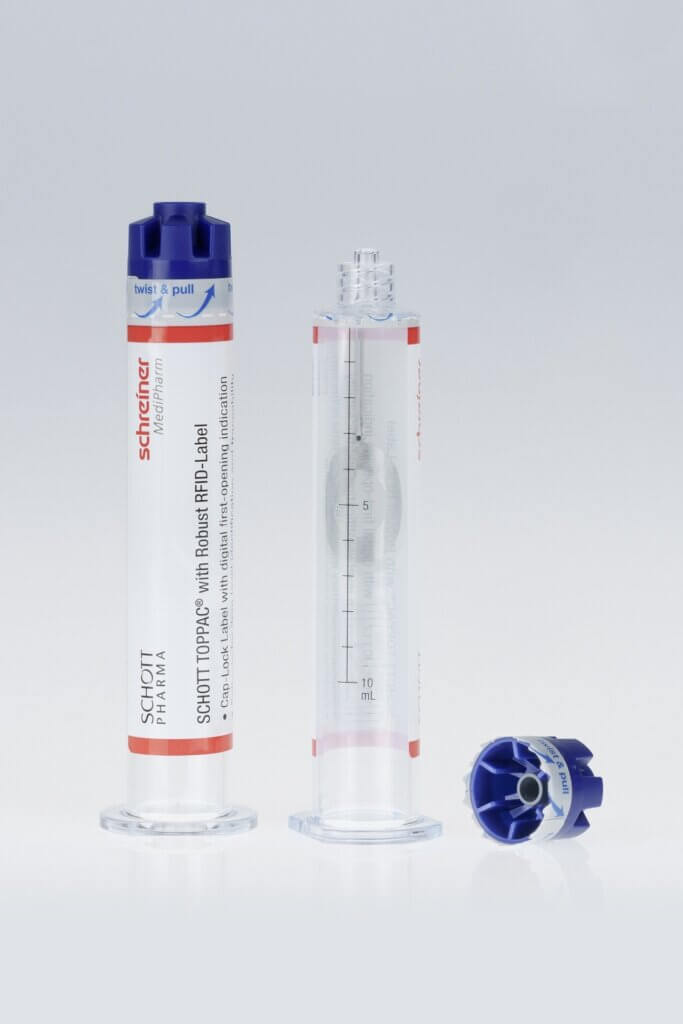 The new Cap-Lock plus RFID is based on the proven principle of Schreiner MediPharm’s Cap-Lock Label and is combined with SCHOTT Pharma’s SCHOTT TOPPAC® infuse COC syringes. Thanks to a special cap design that has the same diameter as the syringe barrel, the Cap-Lock Label wraps around the syringe and cap. A label-integrated irreversible first-opening indication is activated as soon as the cap is opened. The solution safeguards the integrity of the prefilled syringe until final use, thus replacing the usual blister pack by a sustainable alternative enabling considerable CO₂ reductions and cost savings. Additionally, due to optimized packaging and distribution processes as well as reduced space requirements during transportation and storage, it helps enhance efficiencies along the entire supply chain.